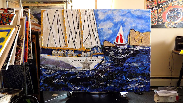 The painting above is a mixed media painting which is not given justice from this photo. There are torn pieces of cloth, tissue paper, cardboard and other textured items which really bring this work alive, especially when seen in person.